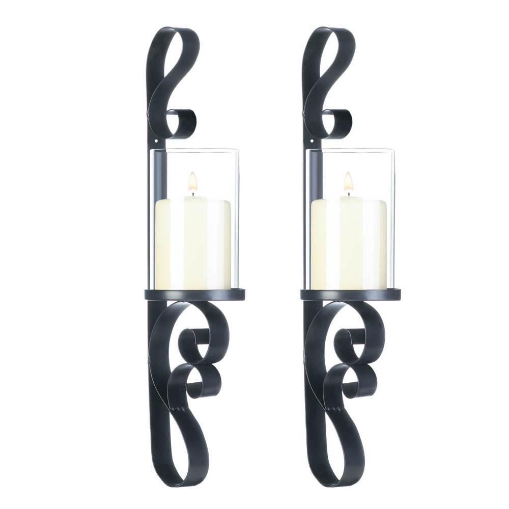• These beautiful iron wall sconces feature curled flourishes and a clear glass hurricane lantern that will highlight any wall with glowing style.