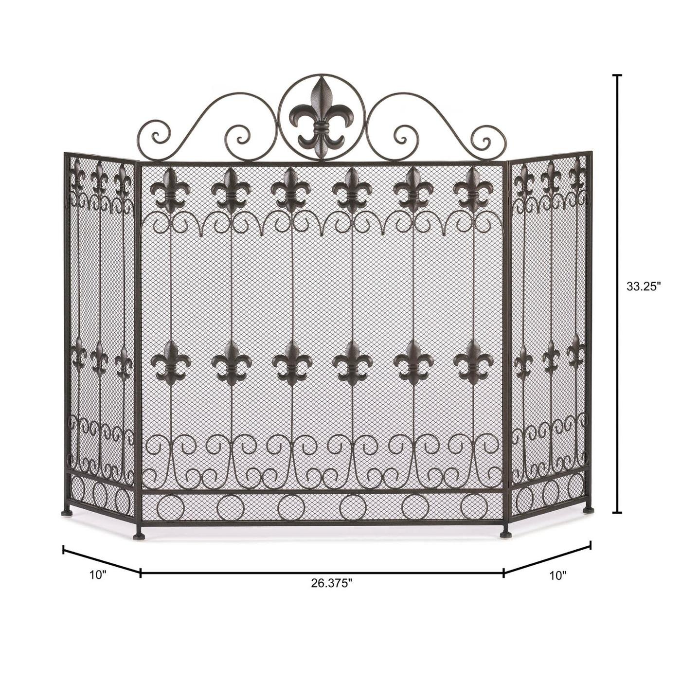 • A touch of French form will add a dash of style to your fireplace. This beautiful iron screen features a gorgeous pattern of fleur de lis metal cutouts accented by scrolling designs. The top features a large fleur de lis that accentuates its continental charm.
