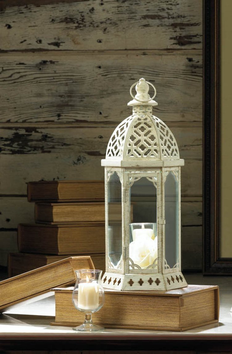 • Where graceful design and vintage patina meet, you'll discover this beautiful candle lantern. The frame is iron, finished in distressed vintage-style white, and the clear glass panels let the light from your favorite candle shine bright.