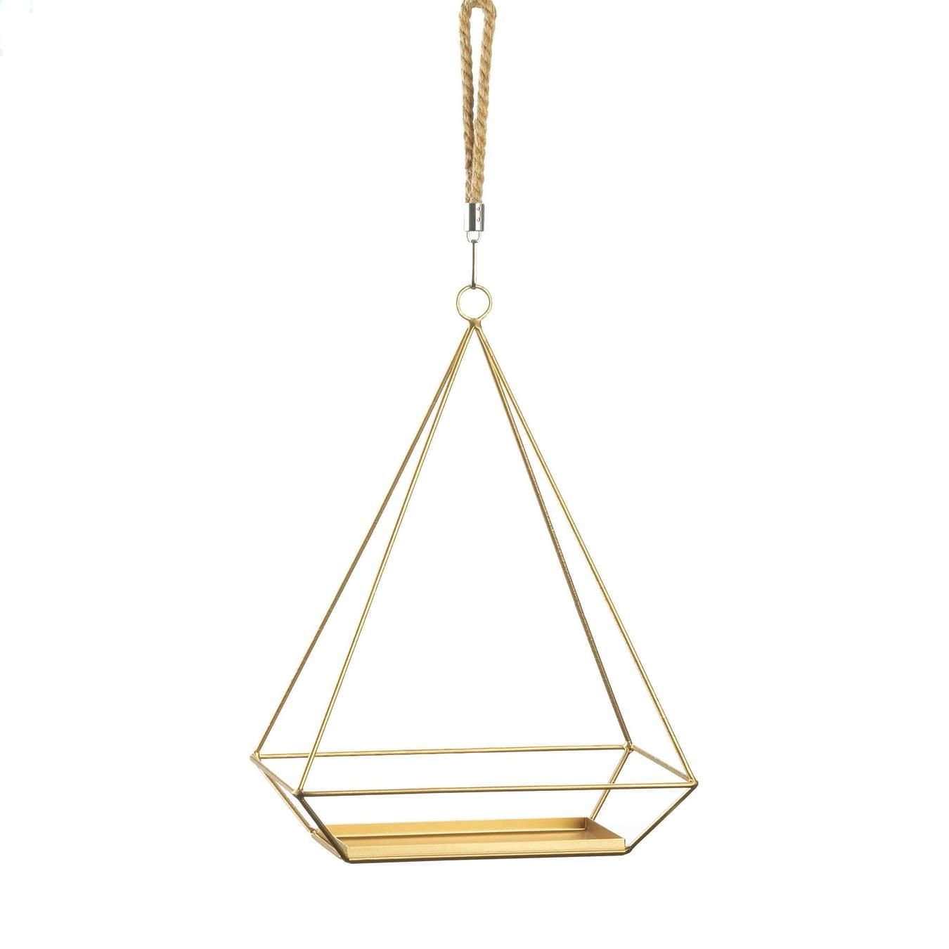 Give your plants a modern look with this gold hanging plant holder. The hanging planter features a contemporary rectangular base and triangle frame with a rope hook for a stunning balance of natural and modern design elements. The large rectangle base offers enough space for a small ivy plant or succulent. Plants not included. Base: 7.25"x 4.25". Hanging Rope: 7.5". Maximum weight limit: 15 lbs. Weight 1 pound. 10.5" x 7" x 14.8". Iron, Rope. UPC Number: 849179041755.